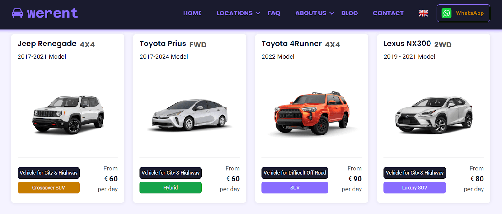 WeRent-ის ავტოპარკი მოიცავს 200-ზე მეტ მანქანას, მათ შორის 50-ზე მეტ მძლავრ 4×4 ავტომობილს. ეს ნიშნავს, რომ მოგზაურებს შეუძლიათ აირჩიონ:
